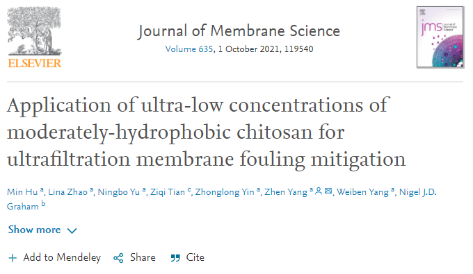 近日,膜领域国际权威期刊Journal of Membrane Science(工程类一区期刊,IF:8.742)以“Application ofUltra-Low Concentrations ofModerately-Hydrophobic Chitosan for Ultrafiltration Membrane FoulingMitigation”(2021, 635, 119540)为题发表了我校化科院化工专业杨维本、杨朕团队关于适度疏水改性壳聚糖缓解超滤膜污染方面的最新研究。超滤技术具有占地面积小、操作简单,出水水质好等优点,被广泛应用于水处理行...