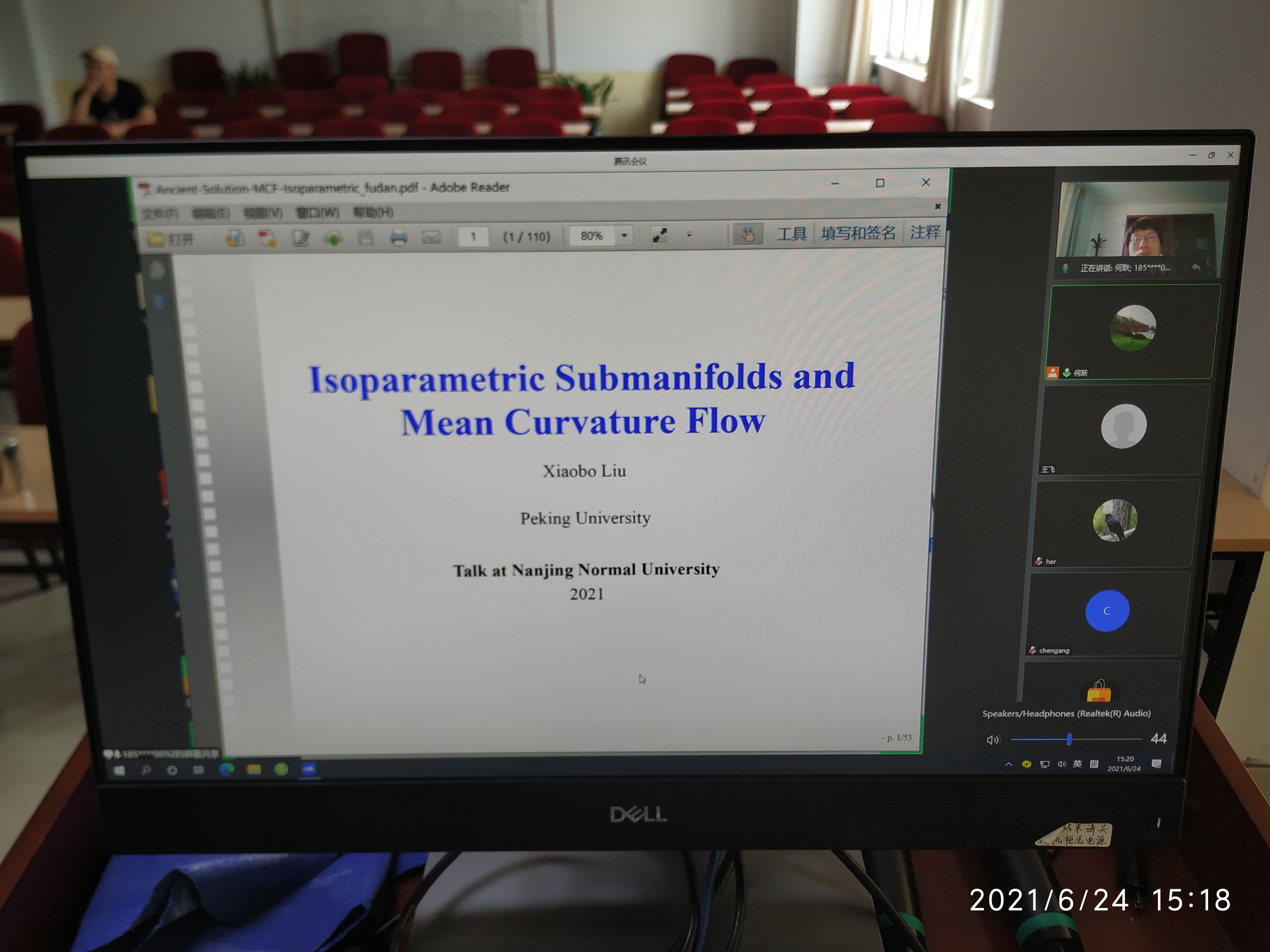 2021年6月24日下午,北京大学讲席教授、北京国际数学中心副主任刘小博教授应邀给数科院的师生做了题为“Isoparametric Submanifolds and Mean Curvature Flow”的线上学术报告,应用数学教研究室何跃副教授主持了此次报告会。应用数学教研究室雷雨田教授,几何代数教研室陈慧斌老师、薛非老师,暨南大学赫海龙教授,南京航空航天大学陈钢副教授,以及数学科学学院的研究生共计15人在线上(或线下)参加了本次报告会。刘教授首先...